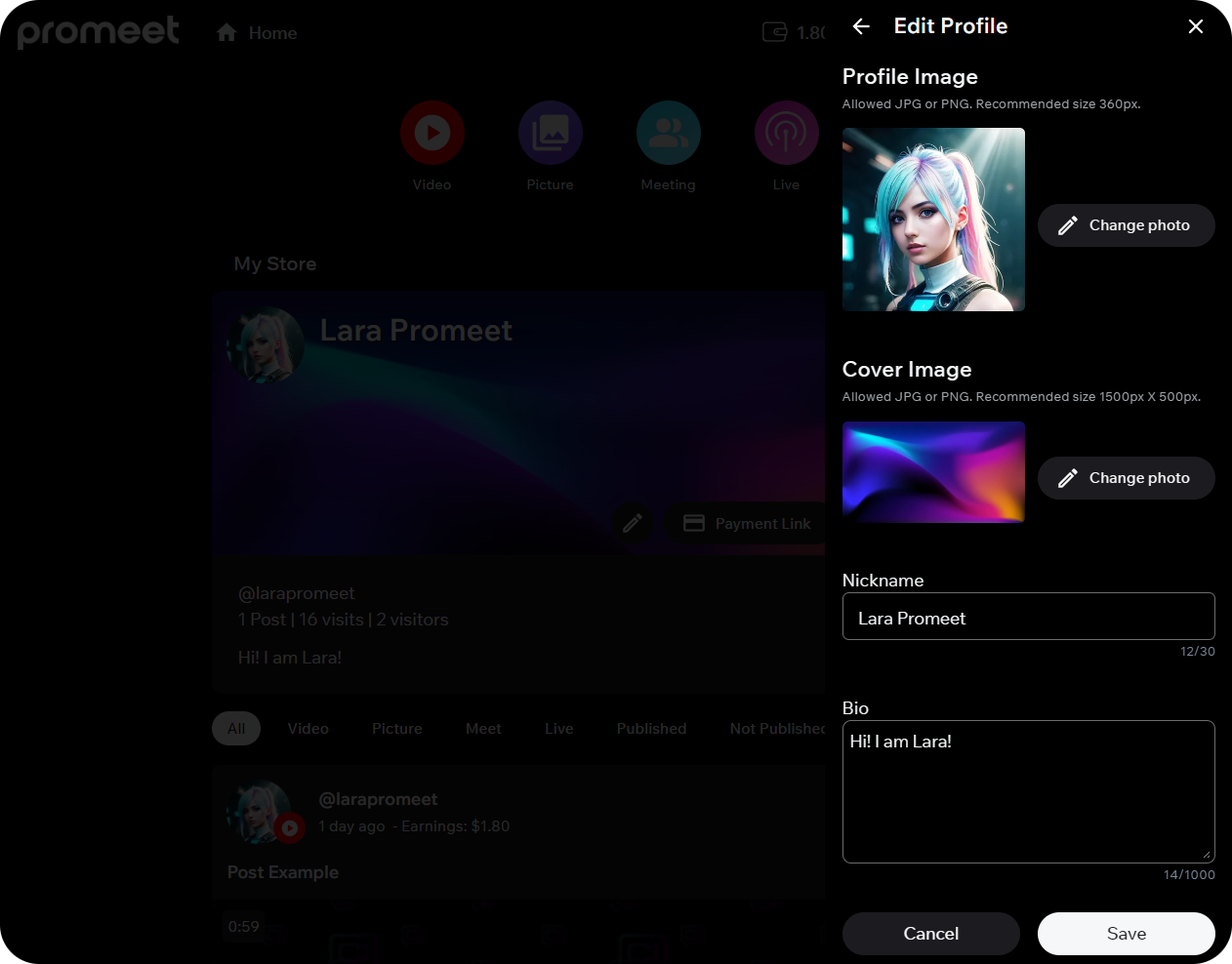 You can also personalize the look of your store by uploading a Profile Image, a Cover Image, a Nickname, and a Bio that also supports markdown.
